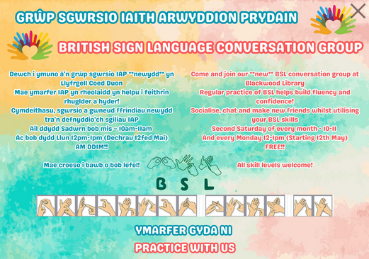 Grwp Sgwrsio Iaith Arwyddion Prydain | British Sign Language Conversation Group 20 Oct 2025 - 12:00 PM to 1:00 PM Caerphilly - Blackwood Library Mae sesiwn bob dydd Llun rhwng 12-1pm a phob ail ddydd Sadwrn y mis rhwng 10-11am. There is a session every Monday between 12-1pm and every second Saturday of the month between 10-11am. Registration not required. Free